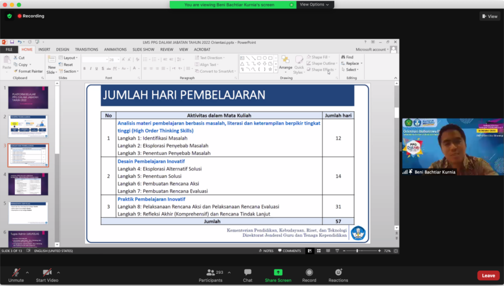 Setelah acara pembukaan selesai dilaksanakan, kegiatan dilanjutkan dengan penyampaian materi tentang sosialisasi pelaksanaan PPG Daljab Kategori I Gelombang II, mengenai Kurikulum Merdeka, PPG Dalam Jabatan tahun 2022 dan Desain Pembelajaran PPG Daljab Kategori I Gelombang II yang disampaikan oleh Ucu Muhammad Afif, M.Pd. Kegiatan dilanjutkan dengan penyampaian materi oleh Beni Bahtiar, S.Pd. mengenai Pendidikan ABK dan Pembelajaran Berdiferensiasi, Literasi dan Numerasi, Computational thingking dan LMS SIMPKB yang akan digunakan dalam proses pembelajaran PPG Daljab Kategori I Gelombang II.