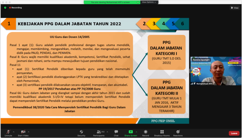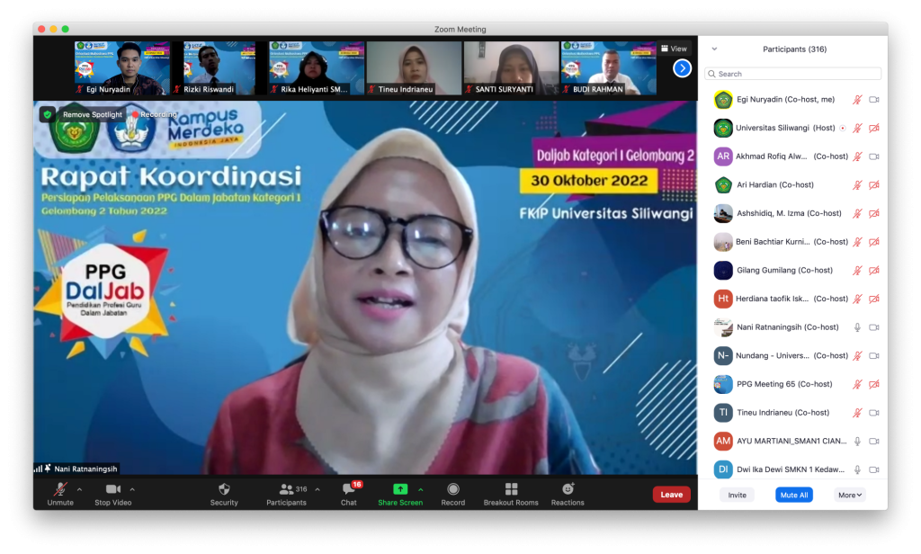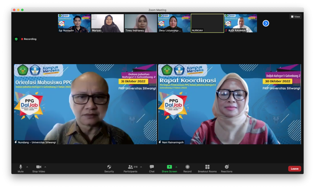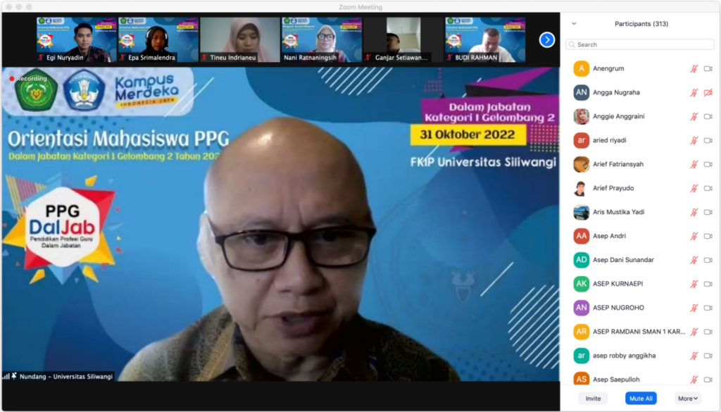 Tasikmalaya (31/10/2022) Berdasarkan surat dari Direktorat Jenderal Guru dan Pendidikan Tenaga Kependidikan Kementerian Pendidikan, Kebudayaan Riset dan Teknologi nomor 2372/B2/GT.00.08/2022 tanggal 21 Oktober 2022 perihal Informasi dan Konfirmasi Kesediaan Calon Mahasiswa Pendidikan Profesi Guru (PPG) Dalam Jabatan Kategori I Gelombang II Tahun 2022, maka pada tanggal 31 Oktober 2022 dilaksanakan Orientasi Mahasiswa PPG Dalam Jabatan Kategori I Gelombang II Tahun 2022 di FKIP Universitas Siliwangi. Kegiatan Orientasi PPG Dalam Jabatan Kategori I Gelombang II ini dilaksanakan secara Daring. Acara pembukaan kegiatan orientasi mahasiswa PPG Daljab Kategori I Gelombang II tahun 2022 ini dipandu oleh Tineu Indrianeu, M.Pd. yang dimulai dari persiapan, pembukaan, menyanyikan lagu Indonesia raya dan dilanjutkan dengan laporan yang disampaikan oleh ketua koordinator PPG (Hj Ipah Muzdalipah, M.Pd.), setelah itu sambutan oleh Dekan FKIP (Dr. Hj. Nani Ratnaningsih, M.Pd.) dan sambutan sekaligus pembukaan acara secara langsung oleh Rektor Universitas Siliwangi, Dr. Ir. Nundang Busaeri, M.T. dan selanjutnya diakhiri dengan pembacaan Do’a.