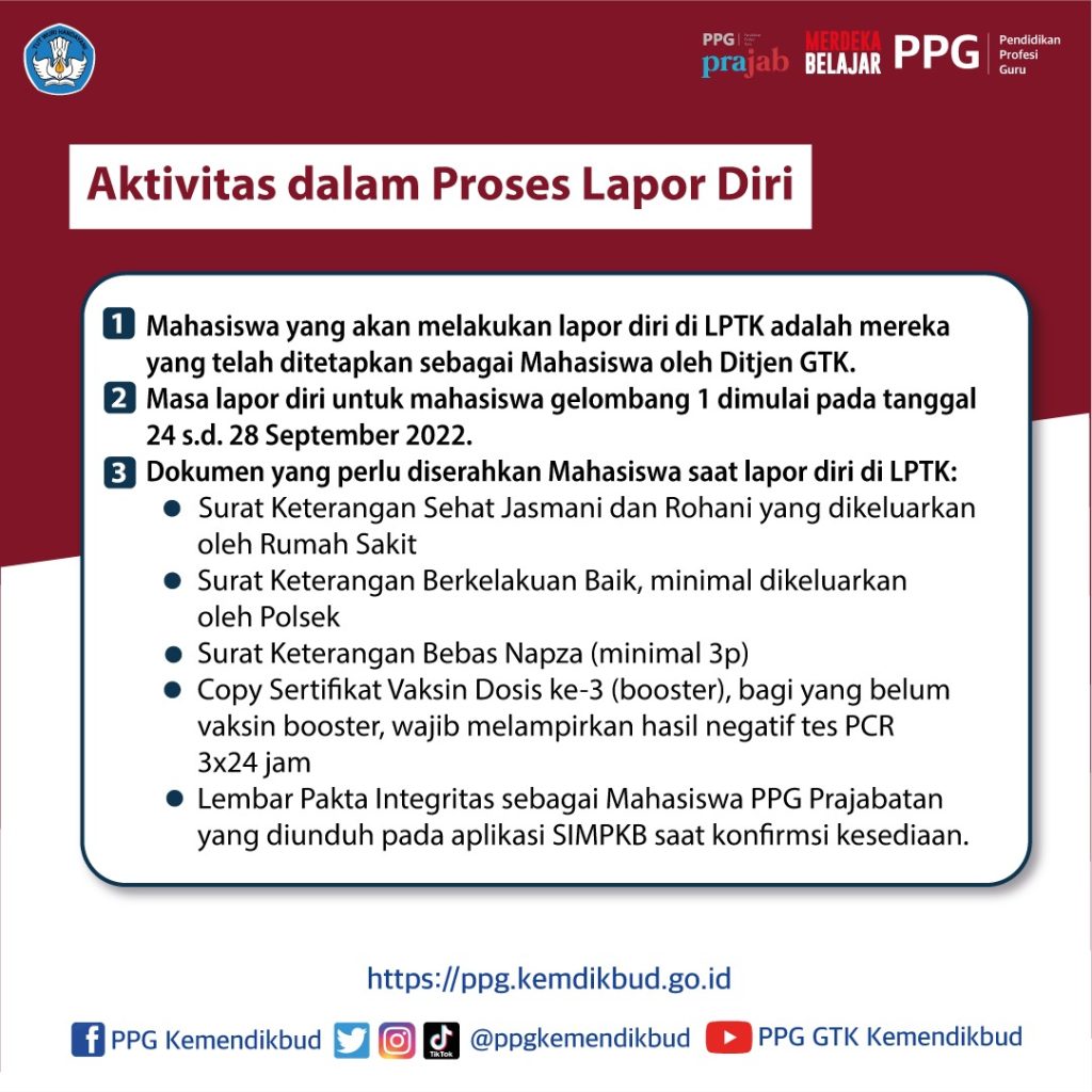 Berdasarkan surat dari Plt. Direktur Pendidikan Profesi Guru Direktorat Jenderal Guru dan Tenaga Kependidikan nomor 1884/B2/GT.00.05/2022 perihal Penetapan Mahasiswa dan Mekanisme Lapor Diri PPG Dalam Jabatan Kategori II Tahun 2022 tertanggal 18 Agustus 2022 maka nama-nama yang tercantum dalam lampiran 2 surat Pemanggilan dan Lapor Diri Calon Mahasiswa PPG Dalam Jabatan Kategori II Tahun 2022 […]