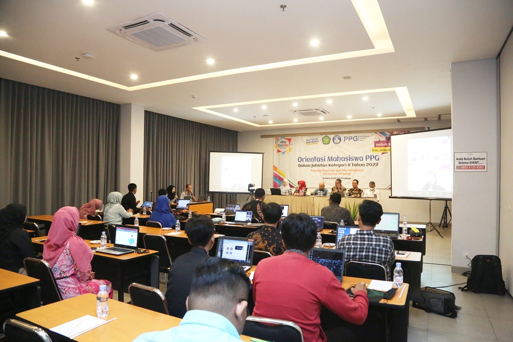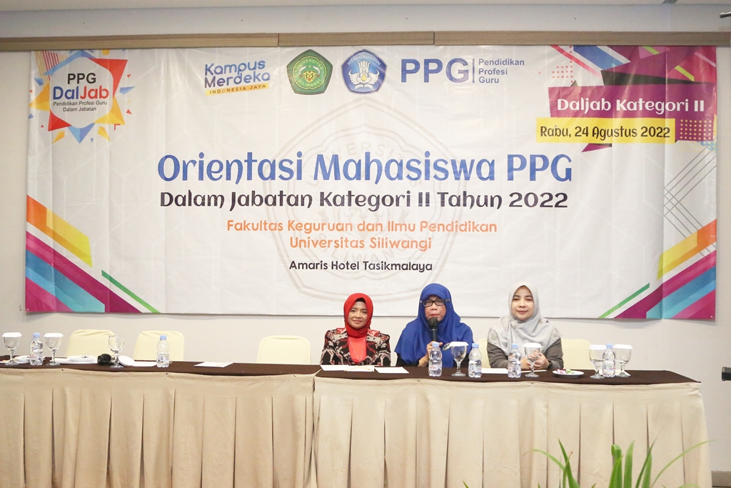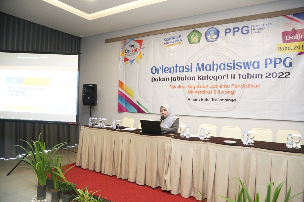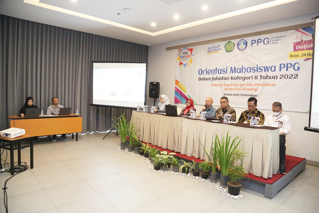 Tasikmalaya (24/08/2022) Berdasarkan surat dari Plt. Direktur Pendidikan Profesi Guru Direktorat Jenderal Guru dan Tenaga Kependidikan nomor 1884/B2/GT.00.05/2022 tanggal 18 Agustus 2022 perihal penetapan Mahasiswa dan Mekanisme Lapor Diri PPG Dalam jabatan Kategori II Tahun 2022, maka akan dilaksanakan Orientasi Mahasiswa PPG dalam Jabatan Kategori II Tahun 2022. Kegiatan yang dilaksanakan secara hybrid ini berlangsung diawali dengan laporan yang disampaikan oleh ketua koordinator PPG (Dr. Diana Hernawati, M.Pd.), setelah itu disampaikan sambutan oleh Dekan FKIP (Dr. Hj. Nani Ratnaningsih, M.Pd.) dan sambutan serta pembukaan acara secara langsung oleh Rektor Universitas Siliwangi, Dr. Ir. Nundang Busaeri, M.T., IPU. Acara juga dihadiri langsung oleh Wakil Rektor Bidang Akademik (Prof. Dr. Dedi Kusmayadi, S.E., M.Si., Ak., CA., CPA), Wakil Rektor Bidang Umum dan Keuangan (Dr. Gumilar Mulya, Drs., M.Pd.), Kepala Biro Umum dan Keuangan (Drs. Nana Sujana, M.SI.), Wakil Dekan I FKIP (Dr. Hj. Iis Lisnawati, M.Pd.) dan Wakil Dekan II FKIP (Dr. H. Endang Surahman, M.Pd.).