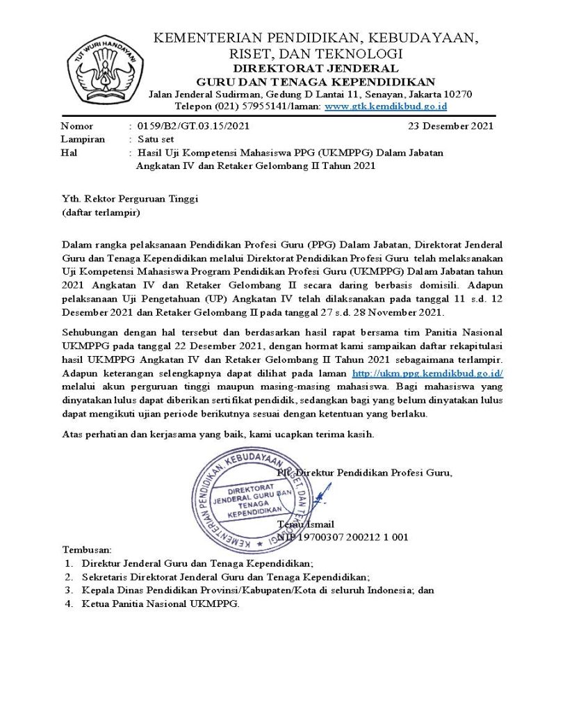 Berikut merupakan surat Pengumuman Hasil Uji Kompetensi Mahasiswa PPG (UKMPG) Dalam Jabatan Angkatan IV dan Retaker Gelombang II Tahun 2021 :