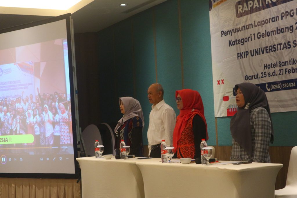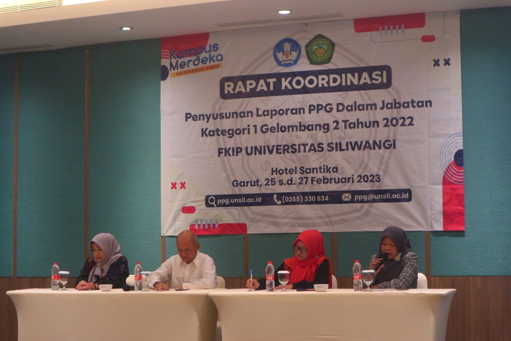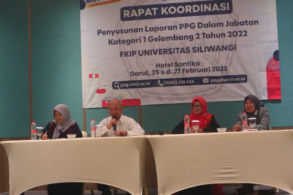 Kegiatan ini bertujuan untuk melakukan penyusunan laporan PPG Dalam Jabatan Kategori 1 Gelombang 2 Tahun 2022 FKIP Universitas Siliwangi. Rapat Koordinasi Penyusunan Laporan PPG Dalam Kategori 1 Gelombang 2 Tahun 2022 dihadiri oleh pimpinan LPTK Universitas Siliwangi yaitu Rektor Universitas Siliwangi Bapak Dr. Ir. Nundang Busaeri, M.T., IPU., ASEAN Eng. Dekan FKIP Ibu Dr. Nani Ratnaningsih, M.Pd., Wakil Dekan 1 Ibu Dr. Diana Hernawati, M.Pd., Wakil Dekan 2 Pak Redi Hermanto, M.Pd., Pejabat Pengadaan FKIP, 7 Koordinator Jurusan yaitu Koordinator Jurusan Pendidikan Bahasa Indonesia, Jurusan Pendidikan Bahasa Inggris, Jurusan Pendidikan Jasmani, Jurusan Pendidikan Geografi, Jurusan Pendidikan Sejarah, Jurusan Pendidikan Matematika dan Jurusan Pendidikan Biologi. Serta perwakilan dari Dosen dan Guru Pamong dari 7 bidang.